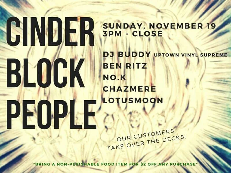 Cinder Block People is a newly opened record store in Harlem. This Sunday they are inviting back some of the DJ's that have shopped with them to play some records. DJ Buddy will be hopping on the set at 6 PM. Bring non-perishable food items to be donated for $2 off your purchase.